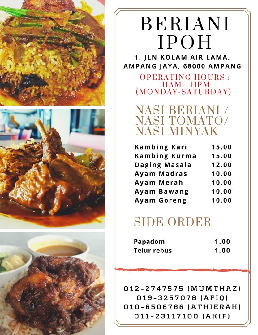 Welcome to Beriani Ipoh, a culinary gem nestled in the heart of Ampang Jaya, Malaysia. Located at 1, Jalan Kolam Air Lama, this vibrant eatery specializes in an array of delectable Beriani dishes and offers an impressive menu that showcases the rich tapestry of flavors found in Indian Muslim cuisine.